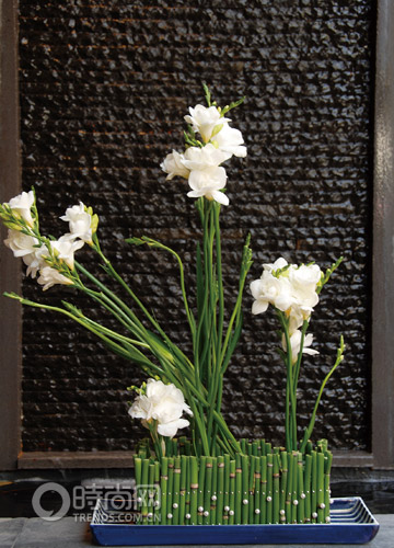 花材:木賊、小蒼蘭;花器:長方形淺盤。小蒼蘭的特異平衡與玄關背景組成一幅立體畫,木賊枝排列表現線條之美。