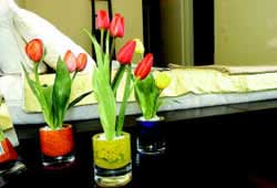 適用地點:客廳茶幾上 方法:用完了的紙巾盒大家通常都是隨手扔掉,有沒有想過可以用它來插花呢?當然可以。為了避免被水浸透,先用塑料薄膜把紙巾盒的內壁包裹起來,再把盆栽的鮮花移植進去,然后用干凈的小石子遮住裸露在外面的泥土,讓花莖和花頭從取紙的地方露出來。只要寥寥幾枝鮮花,就可以完成這樣有創意的作品,簡單而別致。 適用地點:床頭 方法:蠟燭是營造浪漫氛圍的道具,原本裝蠟燭的燭臺現在用來裝些花花草草,更體現出了主人的浪漫主義情懷。只需要將鮮花放在燭臺中,用小石子將它壓住,稍微澆一點水,放在床頭,花朵便可以隨意開放。想象當你躺在床上,看見床頭有這樣一個充滿情調的擺設,感覺是不是比蠟燭更溫馨呢?