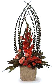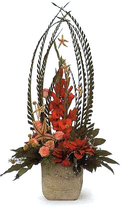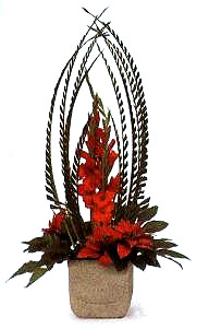 此款為圓錐形的圣誕插花。由散尾葵葉搭起綠色的彎拱形,其中火紅的圣誕花如焰似霞,驅走冬日的寒冷,讓人感受到濃濃的暖意,冬天來了,春天還會遠嗎? 花材:散尾葵、唐菖蒲、仿真圣誕花、月季、八角金盤、黃金球、天門冬草。