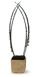 1 先在中間靠后的部位插入4片修剪后的散尾葵葉,形成拱門狀,高度約為花器高度的2.5~3倍。
