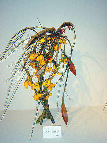![]() 設計:裝飾性設計。黃色的果實花材有從上向下流動之勢,給人一種飄逸的感覺。