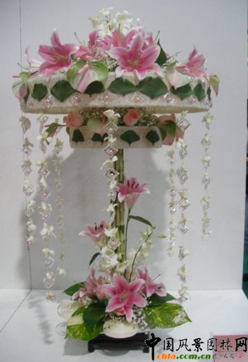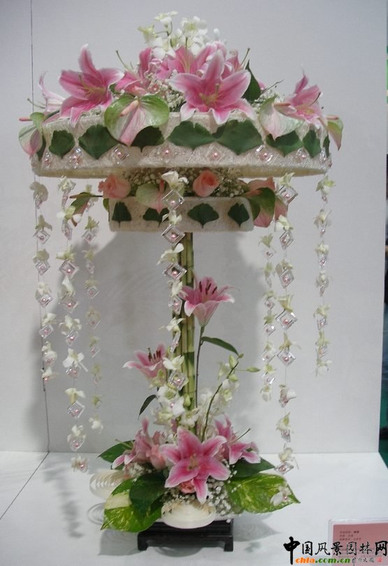 作品簡介:用中國皇家傳統華蓋的元素結合現代花藝手法而設計的餐桌花。表現傳統與時尚、古典與現代結合的理念。