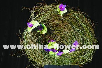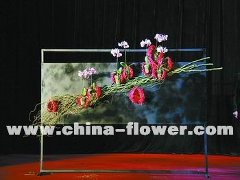 具象花藝 傳遞“家意” 家永遠是讓人眷戀、給人溫暖的地方。本次表演中,澳門知名花藝師周衛民就用自己獨特的花藝風格,具象地詮釋了關于家的主題。 黃色龍柳編織成的一個大大的“鳥巢”造型,似房檐下、樹梢中見到的鳥窩,它給人溫暖、安全的感覺。隨后,周衛民別出心裁地用去掉花蕊的綠掌做襯葉,鮮紅的洋蘭覆蓋其上,由內而外地裝扮在了鳥巢的上面,這就是作品《美麗的家》(如圖2)。隨后的一個作品,周衛民用長長的龍柳傾斜而上,幾個拋開的大紅色藤球疏落綁扎在龍柳上,成為了“樹枝上”一個個的鳥巢,小小的蝴蝶蘭被帶盆放進了幾個鳥巢中,還有一些鳥巢空置著,使人聯想到“離家”這樣一個令人傷感的主題(如圖3)。之后的幾件作品,分別表達了揚帆、振奮等主題。 周衛民此次表演作品用色非常簡單,大多只有簡單的兩種冷熱對比色,造型也多中規中矩,未見太過繁雜和新穎的造型。但其通過如鳥巢、帆船等造型模擬和虛實對比等手法,將其所要表達的對祖國這個“大家”以及個人“小家”的情感,生動、真實地傳遞了出來。 周衛民謙和、沉靜的性格,使得他的作品中呈現出一種大氣、簡單的風韻。此外,周衛民曾經從事室內設計,其作品大多具有很強的空間裝置價值,如用盆栽蝴蝶蘭制作的作品既能節省大量成本,又能延長作品使用期,很受商家的歡迎。