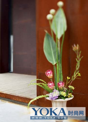 制作:在花器中間插兩片鶴望蘭葉,在葉子前面補充三枝高低錯落的蔥花,定出作品的總體高度。在右邊松散地插一些鳥巢蕨,同時左邊插一枝晚霞起到平衡和填補空當的作用。在低處的焦點位置插上布倫達并補充一些繡球花。