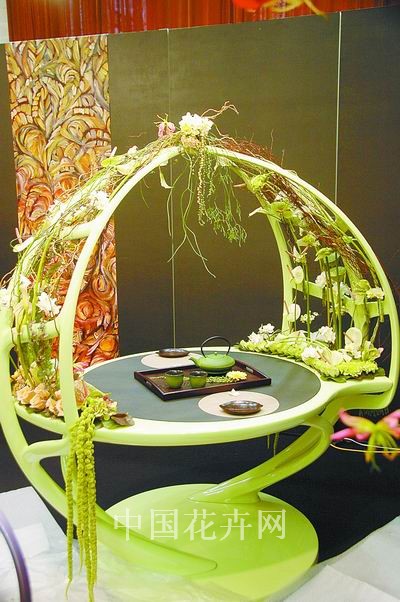中國大陸選手倪志翔的餐桌花表現古人席地而坐,賞花、品功夫茶的狀態,作為“茶海”的圓形又有中國八卦造型的寓意。