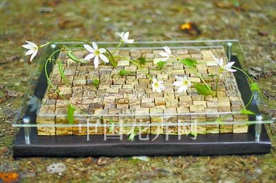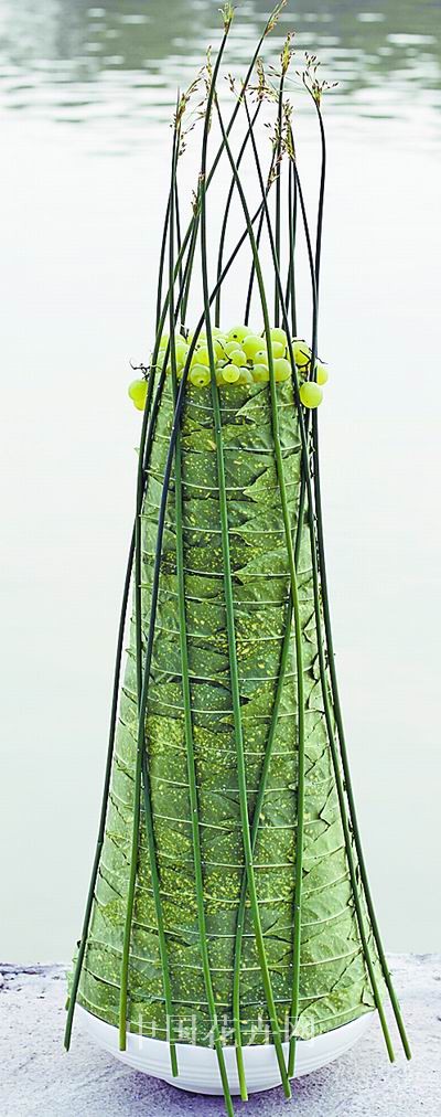 本期主持人:韓海 葉材和花材一樣,不僅可以其自然姿態表現在作品中,也可以通過巧妙加工,變成花藝作品絕好的背景或配飾,讓你的作品與眾不同,本期給大家展示兩個干葉加工技巧。 1、方形壁掛作品 輕靈又有古韻的壁掛作品,最有特色的就是它的背景———它是先以干粽葉剪成四厘米寬的條狀,每兩條粽葉包裹一小塊干花泥,以熱膠封口固定,做成很多小方塊;再以這些小方塊鋪好木頭底盤,以熱膠固定做成的。 清秀的蔥蘭和纏繞的何首烏藤,讓作品靈氣立顯。用有機玻璃四邊框做的裝飾,增加了作品的立體感和通透感,讓它更富于時尚氣息。 需要注意的是,因為要插鮮花,所以在小方塊兒空隙中插花的地方,先要巧妙地固定好鮮花花泥,這樣鮮花的吸水問題就解決了!