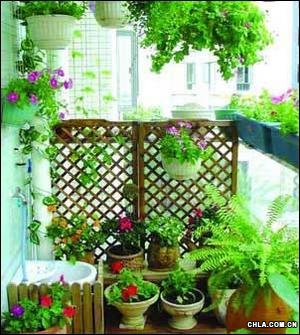 在陽臺上種花栽草也要有巧妙的搭配,否則其效果就會像野草一樣雜亂無章。陽臺的花草園地,既要便于澆水和管理,又要使各種花卉都能充分吸收到陽光;ú莸姆胖靡灿性E竅,通常有鑲嵌式、垂掛式、階梯式和自然式四種!拌偳妒健币话阌迷谝呀浹b修而且面積較小的陽臺上,利用墻壁鑲嵌特制的半邊花瓶式花盆,然后栽種觀葉植物!按箳焓健笔怯眯∏删碌娜萜髟苑N吊蘭等小型植物,然后懸掛在陽臺頂板上。也可栽植藤蔓或其他有纏繞能力的觀葉植物懸掛在陽臺外!半A梯式”是在陽臺內搭起階梯,進行立體盆花布置,一般的植物都可利用這種形式栽培!白匀皇健崩藐柵_外的盆架栽種一些本藤蔓植物,使植物自然下垂,形成一種自然景觀