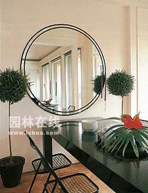 兩株香桃木(愛神木)分放在鏡子兩邊。月桂與橘樹亦置于合宜的地方。桌上有一簡潔的插花:安祖花與荷威棕葉。