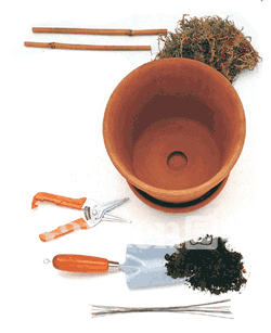 材料與工具:竿、水苔、陶盆、排水墊盆、泥炭、剪刀、金屬絲、絲網(wǎng)、圓棍、瓦楞紙、園藝鏟、盆栽介質(zhì)、心蔓綠絨。