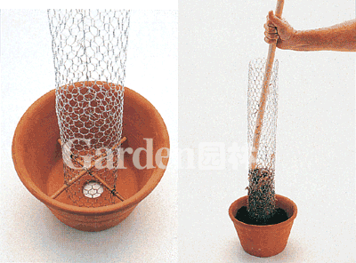 2.竹竿切成合適長度十字狀架在盆底,離底4厘米,將絲網(wǎng)柱嵌入盆中。