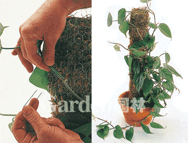 4.將心葉蔓綠絨莖以金屬絲(作成別針狀)固定在網(wǎng)柱上。