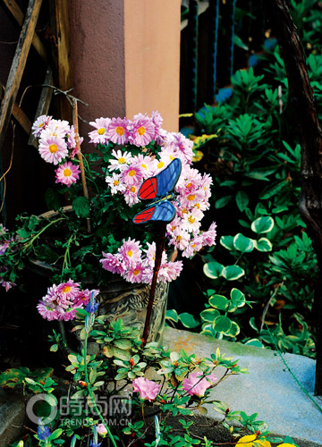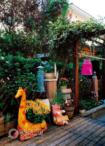 這家的花園里最吸引人注意力的是那件長(zhǎng)頸鹿花器,買來已經(jīng)好幾年了,彩色的長(zhǎng)頸鹿在日曬雨淋之下都已經(jīng)褪色了。今年,媽媽買來廣告顏料和畫筆,由小主人親手為長(zhǎng)頸鹿涂上了彩色的新衣。新繪過的長(zhǎng)頸鹿比原來更鮮艷漂亮了,培養(yǎng)孩子們的動(dòng)手能力,這也算小朋友一次成功的DIY。