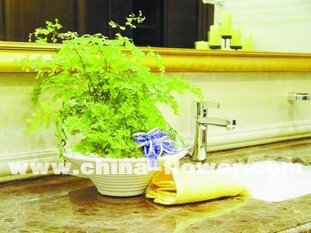 圖2在光線暗淡又潮濕的洗手間,水池旁擺一盆喜陰、喜濕的鐵線蕨是個不錯的選擇;