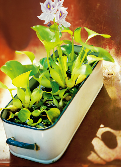 長方形的搪瓷盆里養幾株鳳眼蓮(又稱水葫蘆)和水生蕨,素盆打底,淡彩淺香。