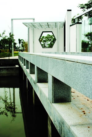 園區內,放眼四周,幾何形水面聚合成全園的中心,景墻、石橋、觀景平臺、雕塑結合水池的平面形式布置,形成向心和內聚的空間格局。在一條長50米的景觀軸上,沿27米長的景墻依次布置羅漢松、片石、石橋、觀景平臺、竹墻等景觀,形成中西交融、“虛實”結合的視覺長廊。