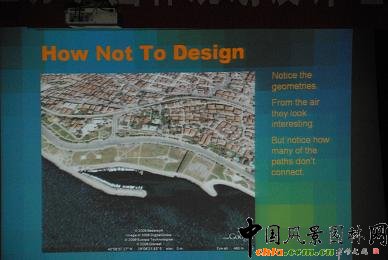 在這種場合,一般與會(huì)者都會(huì)展示許多成功作品的圖片,讓在座各位設(shè)計(jì)師振奮一下精神,但我想打破慣例,一開始談?wù)勎宜娺^的最差的風(fēng)景園林項(xiàng)目。我們從別人錯(cuò)誤中學(xué)習(xí)到的和從別人成功中能學(xué)到一樣多的東西。講完這個(gè)極其失敗的項(xiàng)目之后,我想再談?wù)劺碚摚M梢哉f明這個(gè)項(xiàng)目何以失敗。然后我再向大家展示一下好的作品,讓大家恢復(fù)信心。 很遺憾,這個(gè)例子來自土耳其,而土耳其已經(jīng)成為我的第二故鄉(xiāng),自從我娶了一個(gè)土耳其姑娘為妻,我夫人也是一個(gè)風(fēng)景園林師,但她與這個(gè)項(xiàng)目一點(diǎn)關(guān)系也沒有。我向大家展示這一作品主要是想提醒大家,將園林設(shè)計(jì)看做是圖案創(chuàng)造是愚蠢的,最大的錯(cuò)誤就是被平面的幾何圖形所束縛,而不考慮場地的材料和社會(huì)背景。 ![]()