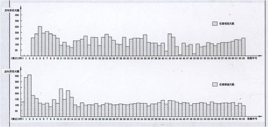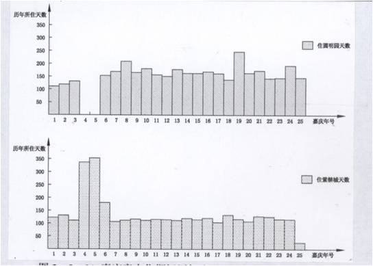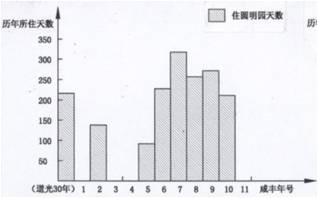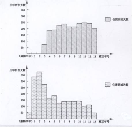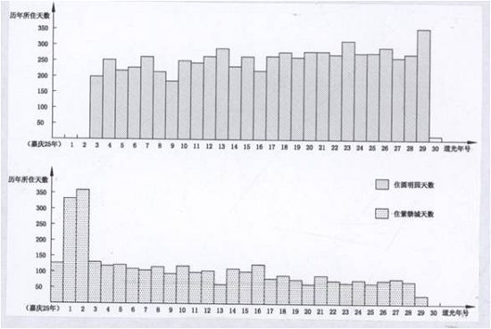 一、圓明園景觀的個性 圓明園具有本身的特性:內容豐富,類型多樣,其中有政務性建筑——舉行朝儀典禮殿堂、日常辦公的場所,寢居建筑——帝后的寢宮、皇子的居所,文化建筑——書院、書樓、戲臺,宗教建筑——佛寺、宮觀,觀農驗農建筑——田圃、村舍,園林建筑——觀賞自然的山水園、寫仿的天下名園、引進的歐洲庭園,其涉及面之廣可謂諸多皇家園林之首。但是到了今天,圓明園還有許多其他的特色沒有得到展示,大家沒有得到她的具體情況。 1、如何認識圓明園的景觀 就其個性來看,最突出的特點在于它是帝王園居理政的場所,雍、乾、嘉、道、咸五朝帝王在此度過其政治生涯,前四帝每位的住園天數(shù)都大大超過在紫禁城居住的天數(shù)。 正因如此,在圓明園建造出名目繁多的園林建筑,他們并非單純的作為園林中的賞景、點景建筑,而是有著特定的使用功能和文化內涵,透過這些建筑可以折射出當時的社會文化價值取向,帝王的心理需求,通過剖析這些類型各異的園林建筑,使我們對圓明園這座皇家園林的特殊性有所認識。所以,圓明園是一部活的歷史,是了解清代社會的教科書。 清代五朝皇帝駐蹕圓明園與紫禁城天數(shù)比較。