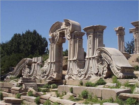 西洋樓 西洋樓景區,本為主動引進外國造園藝術的行為,但乾隆卻以大國君王帶有蔑視的口氣說:“中國地大物博,水法不過工巧之一端。” 自乾隆十二年開始籌劃,至乾隆十八年起至乾隆四十八年相繼建成諧奇趣、萬花陣、海晏堂、方外觀、大水法、遠瀛觀、線法山、方河、線法畫等。這些建筑采用巴洛克或洛可可風格,覆以中國的琉璃瓦屋頂,每棟建筑布局和細部處理有所不同。諧奇趣、方外觀、海晏堂都使用了極富裝飾性的室外大樓梯,并與室外噴泉相結合,具有濃厚的十八世紀歐洲園林情趣。