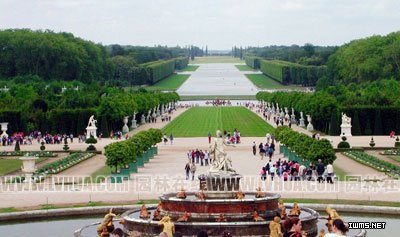 位于巴黎西南18km,原來有路易十三修建的小宮殿,1651年,路易十四請建筑師勒布倫和園藝師勒諾特進行設計建造。凡爾賽占地面積巨大,最大時達到6000ha ,凡爾賽花園有“世界奇跡”之稱的、成為輝煌燦爛的休閑場所。宮殿是東西向的,從中放射三條林蔭大道穿越城市,園林位于宮殿的西面,從近處的花園過度到遠處的林園。凡爾賽強調由“自然”景色向幾何建筑形體的轉換,而植物、水體和地形的自然生長及運動態勢都被控制于人類,特別是皇室貴族手中。
