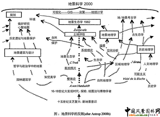 從學(xué)術(shù)與理論發(fā)展來(lái)看,建筑、地景、城市規(guī)劃學(xué)科都在展拓: ——建筑方面走向“廣義建筑學(xué)”; ——規(guī)劃方面更在走向多學(xué)科的融合,涉及科學(xué)、技術(shù)、人文、藝術(shù)等內(nèi)容; ——園林學(xué)也不例外,下文將詳述。 三個(gè)學(xué)科在“展拓”的過(guò)程中,都有互相融合與變革的一面。 3.4 清華大學(xué)暖通專(zhuān)業(yè)的展拓 20多年來(lái),在江億院士帶領(lǐng)下的清華大學(xué)暖通專(zhuān)業(yè)從傳統(tǒng)的暖通工程,該專(zhuān)業(yè)開(kāi)始 面向人居環(huán)境、面向城市、面向建筑,從建筑物理基礎(chǔ)科學(xué)多方位的轉(zhuǎn)向了“節(jié)能”、“減排”的工作,這也是一種很有創(chuàng)造性的展拓,可以作為建筑技術(shù)科學(xué)展拓的佳例。 3.5 談園林專(zhuān)業(yè)的重組的幾個(gè)基本原則 3.5.1 面向人居環(huán)境 F.L.Olmsted,Ian McHarg等,無(wú)不是因時(shí)而變,因事而造,創(chuàng)造性的解決了人居環(huán)境問(wèn)題而推動(dòng)學(xué)科發(fā)展的核心問(wèn)題。 麥克哈格在寫(xiě)完《設(shè)計(jì)結(jié)合自然》之后即轉(zhuǎn)向關(guān)注人類(lèi)生態(tài)學(xué)(Human ecology)是走向了人與環(huán)境的整體對(duì)象。 西方也曾有Human habitats: a focus for design education in the 21st century一文,文中試探性的提出了二十一世紀(jì)設(shè)計(jì)學(xué)教育應(yīng)該以人居環(huán)境為對(duì)象,關(guān)注人口增長(zhǎng)、生境的破壞、人類(lèi)健康等重大問(wèn)題。 以此整體做為對(duì)象是發(fā)展學(xué)科的需要。 3.5.2 以生物學(xué)為基礎(chǔ) 大自然是由基本的非生物體和生物體構(gòu)成的,生物學(xué)是研究生命現(xiàn)象和生物活動(dòng)規(guī)律的科學(xué)。 要對(duì)于大自然,對(duì)于種種人居環(huán)境問(wèn)題有所應(yīng)對(duì),就應(yīng)以此為基礎(chǔ)。 我國(guó)生態(tài)環(huán)境問(wèn)題還表現(xiàn)在野生動(dòng)植物物種數(shù)量銳減,各類(lèi)生物物種受威脅的比例普遍在20%-40%。 僅以此例,足以說(shuō)明問(wèn)題的嚴(yán)峻性和它在園林中的地位。 3.5.3 以生態(tài)學(xué)為綱 西方現(xiàn)代文明,生態(tài)學(xué)(ecology)已經(jīng)成為最為先進(jìn)的學(xué)科之一,ecology的觀念在不同的領(lǐng)域有所發(fā)展。應(yīng)作為地景學(xué)的基礎(chǔ)。 有論者認(rèn)為,這個(gè)學(xué)科生物學(xué)和生態(tài)學(xué)的課程應(yīng)該占到50%~60%,地學(xué)課程應(yīng)該占到40%~50% 發(fā)展最快,收獲豐富,應(yīng)用最為廣泛的是地景生態(tài)學(xué)。 景觀生態(tài)學(xué)的發(fā)展和廣泛應(yīng)用可以說(shuō)是地景學(xué)最為革命性的變化。 有論者認(rèn)為,這個(gè)學(xué)科生物學(xué)和生態(tài)學(xué)的課程應(yīng)該占到50%~60%,地學(xué)課程應(yīng)該占到40%~50%。 “軟”、“硬”學(xué)科要相互融合,傳統(tǒng)的造園、設(shè)計(jì)為“軟”,這些傳統(tǒng)要和生態(tài)、技術(shù)等“硬”學(xué)科銜接,生態(tài)學(xué)明顯為“硬”,而要逐步通過(guò)文化、藝術(shù)來(lái)改造與融合,使其變“軟”,變?yōu)橐话阍瓌t,為更多的人所理解和接受。 我在《廣義建筑學(xué)》中曾提過(guò)“軟的學(xué)科要變硬,硬的學(xué)科要變軟”,“感覺(jué)到的東西不一定能理解它,只有理解的東西,才能更深刻的感覺(jué)它” 。 3.5.4 以多學(xué)科整體架構(gòu) 學(xué)術(shù)的發(fā)展寄托于多學(xué)科充實(shí)與融貫。 ![]() 地景科學(xué)的發(fā)展 Marc Antrop針對(duì)地景學(xué)的發(fā)展描繪了一個(gè)生動(dòng)的譜系,其中可以看到多學(xué)科的交叉和交融現(xiàn)象。他將地景學(xué)的總體發(fā)展劃歸為三個(gè)傳統(tǒng): 第一是自然科學(xué),其中地景生態(tài)學(xué)起著主導(dǎo)作用; 第二是人文科學(xué),其中多運(yùn)用歷史地理、歷史生態(tài)學(xué)、人文主義和符號(hào)學(xué)的途徑; 第三是應(yīng)用科學(xué),主要是指地景設(shè)計(jì)、建筑設(shè)計(jì)與規(guī)劃領(lǐng)域。 在中國(guó),專(zhuān)業(yè)分化比較厲害,各個(gè)專(zhuān)業(yè)都有自己的協(xié)會(huì)和組織,各自有各自的語(yǔ)言體系,不容易溝通。 但是實(shí)際上,一旦我們進(jìn)行人居環(huán)境建設(shè)就會(huì)發(fā)現(xiàn),我們面對(duì)的是同一塊土地,面臨相同的問(wèn)題。 要對(duì)于人居環(huán)境有貢獻(xiàn)必須建立大的學(xué)科體系,要有大目標(biāo),有宏觀的視角,努力形成可以溝通的語(yǔ)言體系。 中國(guó)建立整體的跨學(xué)科的地景專(zhuān)業(yè)應(yīng)該是孜孜以求的目標(biāo)。 3.5.5 以人居環(huán)境設(shè)計(jì)方法為手段 大小不同尺度的規(guī)劃設(shè)計(jì),綜合應(yīng)用各種設(shè)計(jì)手段。 建筑、城市規(guī)劃、園林的“三位一體”三者互相交叉,互為滲透,互為補(bǔ)充。 不論城市規(guī)劃、區(qū)域規(guī)劃還是風(fēng)景園林,其設(shè)計(jì)都是以地理為基礎(chǔ)的。 設(shè)計(jì)工作者要加強(qiáng)對(duì)宏觀地理概念的理解,也要注重對(duì)不同尺度地理環(huán)境的再認(rèn)識(shí)和再發(fā)現(xiàn)。 這樣說(shuō)不是說(shuō)我們的專(zhuān)業(yè)要讓位于地理,而是有了更大的展拓。
