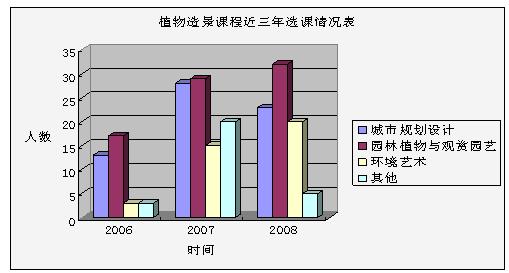 環境藝術設計專業涉及區域景觀設計、城市生態植物研究、室外環境設計、城市廣場、小品設計等方面;室內設計主要包括文化和物質環境意識,室內空間、室內裝飾、室內陳設、室內環境以及對人們生理、心理影響的研究。專業內容均與風景園林教育有一定的交叉和融合,植物景觀的創造亦是其中不可缺失的重要部分,在教學中,要充分發揮風景園林觀賞植物應用的優勢,將植物造景與環境藝術、室內設計的知識體系相融合,讓學生在專業的學習中,利用掌握的植物造景知識靈活應用于所學專業,提升設計作品的科學性和藝術性。筆者通過多年的教學實踐經驗,總結風景園林教育中不同專業植物造景課程所需掌握的知識廣度和深度,從而直觀地剖析園林植物配置與造景課在各專業中的定位。(見表3) 植物造景作為當今非常熱門的課程之一,受到越來越多高校和園林工作者的關注,許多院校也針對當前的需要相繼開設了這門課程。結合南京林業大學近三年來園林植物配置與造景課選課情況進行比較分析(見表4),不難看出,選修本課程的研究生總人數呈現出逐漸遞增的趨勢,園林植物與觀賞園藝專業學生占據主導地位,其次為城市規劃設計和環境藝術專業,表明本課程正處于逐漸發展之中,并向著專業化、多元化兩個方向發展,植物造景也會以其專業化的技能和必要的知識體系,受到越來越多的重視。 表3:風景園林教育中不同專業植物知識儲備比較分析