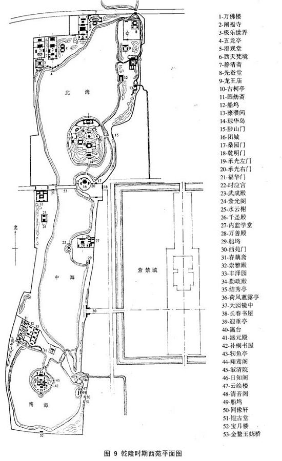 圖片引自《中國古典園林史》 北京北海和中南海原為故河床,開辟為有聚有散的帶狀水系,所以三山按帶狀分布。清漪園仿杭州西湖蘇堤之勝,有所創意地建了西堤,以西堤六橋著稱。前湖水域自然三分,三山島各據相對獨立之水域而以龍王廟為主島。而圓明園是以福海為載體,福海傳承了北宋艮獄中因道家追求的最高境界“大方無隅”所呈現“大方沼”的水型,和“相去方丈”之說,因而安三島于福海中心。承德避暑山莊之三仙島按“芝逕云隄”之立意和用地條件從“萬壑松風”下面的湖面引拱橋若生長點,按靈芝生長之型寫意性的體現其菌把,菌體的堤島相貫連的三仙山形象,主次分明,形象自然。這種“一法多式”的借景理法值得總結和汲取。