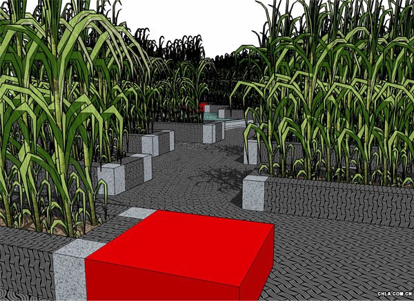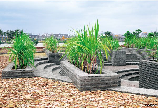 在此基底上,高起條狀種植臺,平行分布,如同田園,種植當地盛產的甘蔗。種植臺沿邊為座凳,供人在蔗園中休憩。