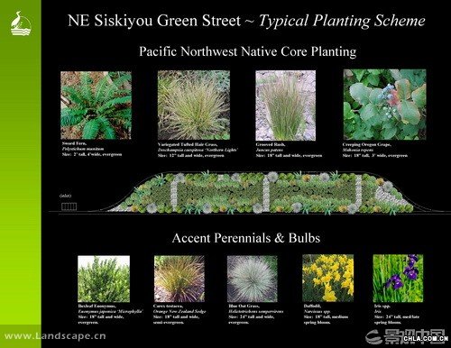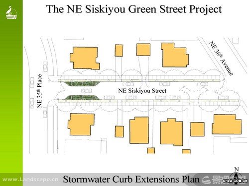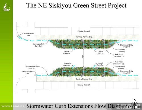 NE Siskiyou 綠色街道被認為是波特蘭市最好的綠色街道雨洪改造工程實例之一。首先這種形式在所有地方用雨洪收集管道代替典型的住宅街道停車區,以便于收集流失的雨水。2003年秋天建成的NE Siskiyou綠色街道,例證了可持續的雨洪管理原理,并充分體現了簡單、節約成本以及創新的設計解決方案的價值。