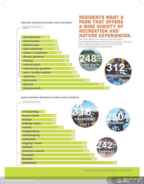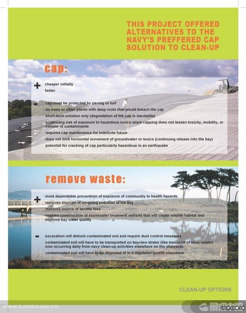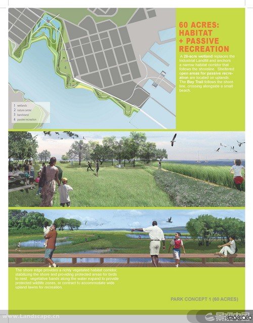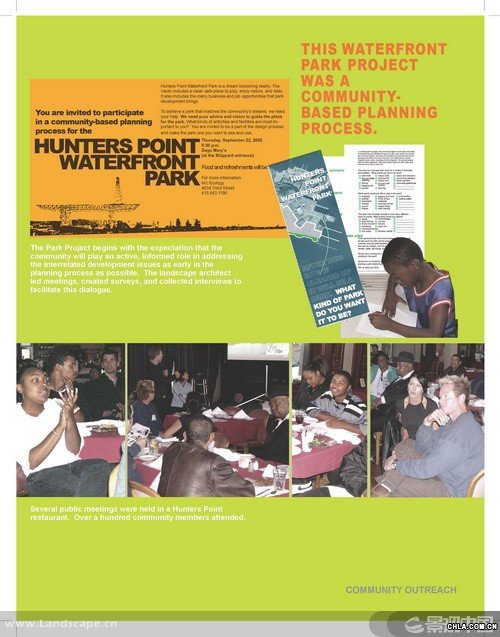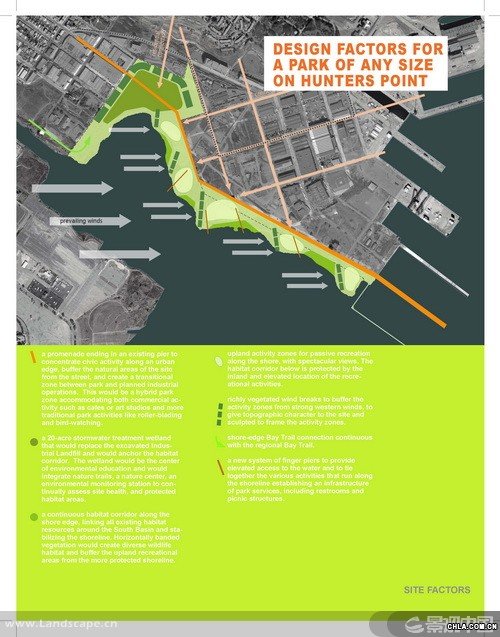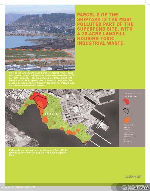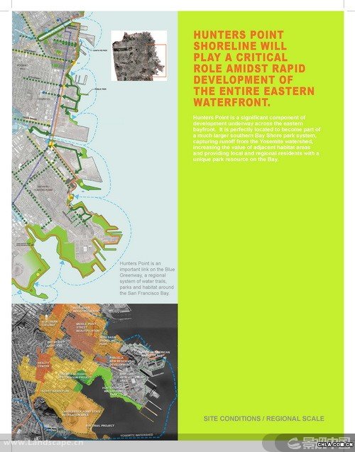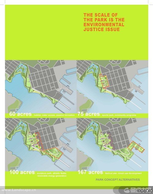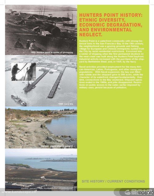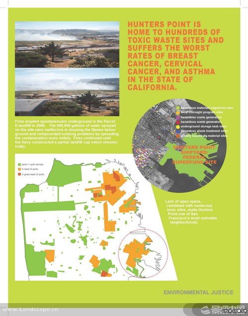獵人角(Hunters Point)是一個坐落于舊金山的前軍事基地,現在瀕臨被改建為城市工業區的邊緣。受雇于非盈利性的環境正義組織的景觀設計師分析了位于獵人角船廠的公園發展計劃并制定了規劃理念。調解了社會對工地污染與人居中心潛力的沖突問題,該項目證明了一個規模龐大的公園可以成為一個城市的經濟發動機,凈化空氣的催化劑,和實現環境正義的關鍵一步。