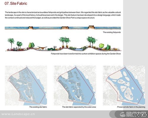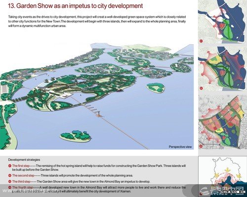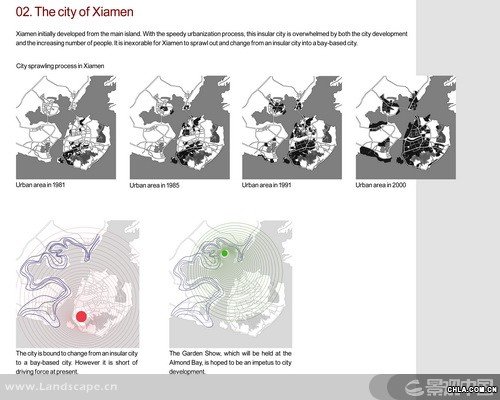 規(guī)劃方案利用本土地域特色作為切入點(diǎn),科學(xué)地解決園博會(huì)的功能和景觀問題。通過組織新的景觀結(jié)構(gòu),與原有的地域信息形成新的結(jié)構(gòu)體系,滿足展會(huì)時(shí)和展會(huì)后的需要。并且,在設(shè)計(jì)之初,就考慮到整個(gè)規(guī)劃要與2007年中國廈門國際園林花卉博覽會(huì)的主題“海灣綠島,共有家園”相吻合,與本土地域的特征和廈門的大環(huán)境相吻合。廈門園博會(huì)會(huì)址選在廈門市杏林灣一片面積為6.76平方公里的魚塘上,這里將是未來廈門島外的城市新區(qū)。