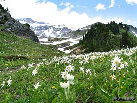 雷尼爾山國家公園(一譯瑞尼爾山國家公園)是一座位于美國華盛頓州皮爾斯郡東南的國家公園。建園于1899年3月2日,是美國第五座國家公園。公園面積為954平方公里,包括了雷尼爾山全境——一座4392米高的層狀火山。這座山從周遭的平地中陡然升起,使得園區海拔分布從490米到超過4300米。園區的95%是保存在原始狀態,自1988年即被認定。最高點在死火山雷尼爾山,周遭滿是峽谷、瀑布、冰穴以及數量超過25個的冰河。休眠的火山常常常常籠罩在云里,每年為峰頂帶來數量龐大的雨水與雪花,并且讓周末許多前來觀賞的游客無法看到神秘面紗后的峰頂。公園內有景色優美的高山原、湖泊、瀑布和溫泉,多花卉和野生動物,包含了古代森林與亞高山帶草原等特色,是西北太平洋區的自然景致。