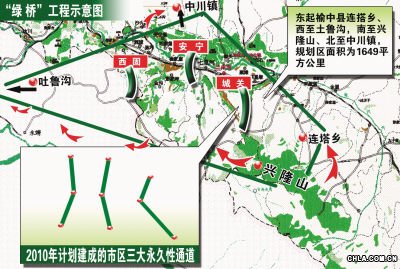 “綠橋”既然稱之為“橋”,自然就有另一頭,這個(gè)另一頭就是城區(qū)的園林綠化。蘭州市的城市綠地系統(tǒng)經(jīng)過(guò)五十年的規(guī)劃建設(shè),已經(jīng)初步形成了比較有規(guī)模,比較合理的網(wǎng)絡(luò)結(jié)構(gòu):以南北兩山綠地為生態(tài)屏障,以城市主次干道綠地為基本骨架,以公園、廣場(chǎng)、旅游綠地為主要支點(diǎn),東起榆中縣連搭鄉(xiāng)、西至土魯溝,南至興隆山、北至中川鎮(zhèn),規(guī)劃區(qū)面積為1649平方公里。市區(qū)范圍東起桑園子峽包蘭鐵路橋,西至宣家溝口,相距35公里;南起皋蘭山頭營(yíng)村,北至甘肅鋁廠,南北最大距離為17.5公里。到2010年蘭州市計(jì)劃建成市區(qū)三大永久性綠色通廊,即仁壽山公園———崔家大灘———彭家坪公園綠色通廊;白塔山公園———伏龍坪———蘭山公園綠色通廊;青白石———雁興公園———水景公園桃樹坪防護(hù)林帶綠色通廊。這三大綠色通廊既是生態(tài)景觀通廊,也是綠化防護(hù)通廊,可以有效地改善城市的人居環(huán)境,改善市區(qū)氣候狀況。提出建設(shè)“綠橋”的設(shè)想就是依據(jù)城市的綠地規(guī)劃,城市園林規(guī)劃的兩橫三縱,讓環(huán)城生態(tài)圈與城區(qū)園林規(guī)劃中的綠色資源實(shí)現(xiàn)對(duì)接,在周邊天然森林與蘭州城區(qū)園林之間,選擇有條件的地方,以15公里的寬幅架設(shè)“綠橋”,讓天然森林的生態(tài)效應(yīng)流進(jìn)城區(qū),從而改變城區(qū)的大氣環(huán)境。