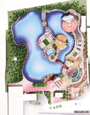 此次再造園,游樂園在整體規劃上頗動了番腦筋,人工湖改造可見匠心。該園借助原“水上世界”靠近山體的人工湖可利用部分,適當擴展,使湖形更加優美,形成山水相依、靚船游弋的水墨動畫般休閑景觀。依山伴水的地域部分為休閑廣場,在這一區域設有可觀賞節目的舞臺,可休閑的座椅、長廊,可消費的規范化商服綜合點,從而激活大面積的閑置空間。設有張拉膜遮陽棚,在獨自成景的同時,還可為游人遮陽避雨。