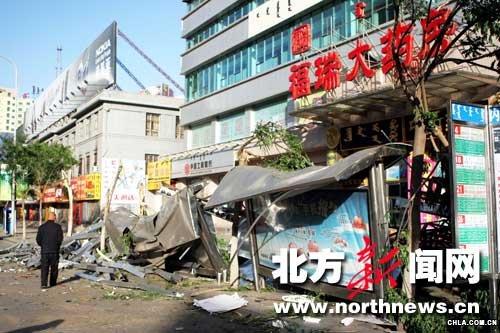 5月28日21時15分左右,記者接到熱心讀者打來的電話,中山東路福瑞大藥房樓頂上的巨型廣告牌被風刮到了馬路上,行至此處的4路公交車被砸壞。21時30分許,記者趕到現場,看到福瑞大藥房門前的廣告牌碎片堆了2米多高,該處的非機動車道完全堵塞,一輛4路公交車停在路邊,公交車的前擋風玻璃破碎,所幸沒有造成人員傷亡。記者數了一下,該處共有一個路燈桿和兩個公交候車亭以及6棵樹被砸壞。