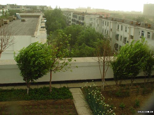 據克拉瑪依區環保局那仁副局長給我們介紹,這個美麗的空中花園是在2005年建起來的,由于他們的局長王長嶺酷愛綠化,在建大樓時已經設計了樓上建立花園的最初方案,對樓上花園綠化管線的分布以及樓地基設計都進行了很好的安排,泥土層、沙石層及防滲處理都安排得當。我們看到大約300平米的樓頂綠化地,布置的很合理,有蔬菜,花卉,蘋果樹,櫻桃樹等7種樹木,長勢特別茂盛。那仁介紹“屋頂花園”經過專家論證非常適合克拉瑪依這樣干旱、高溫的城市發展,對樓房建筑不產生負面影響,并且能明顯的改善生態。