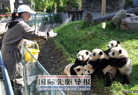 四川臥龍中國保護(hù)大熊貓研究中心的工作人員在給大熊貓投食。地震中熊貓同樣受了驚嚇,也需要心理治療。本報(bào)記者 陳燮/攝