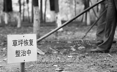 昨日下午,記者在浣花溪公園看到,原先的綠草坪裸露出成片黃色的泥土,有些地方堆著人高的泥巴,一些被損草皮已被掀至一邊堆得老高,“草坪恢復(fù)整治中”的提示語(yǔ)言隨處可見,好幾名工人忙著翻土、打藥和鋤草。綠化工人夏家樹揚(yáng)起鐵鍬深挖植樹的窩,他說(shuō)這里的子死了不少,只有砍掉死掉的枯竹,重新補(bǔ)種女貞才能讓綠色多起來(lái)。