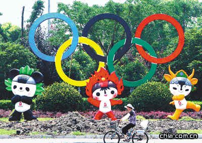 ② 7月6日,上海市江區街頭,巨大的奧運五環和吉祥物在路邊迎客。