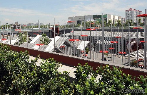 奧林匹克森林公園中心區下沉式廣場兩側的綠化工程已經結束(7月6日攝)。在奧林匹克森林公園中心區,有一處經過精心打造的下沉式廣場。這個被稱為“地下宮殿”“中華傳統藝術長廊”的下沉式廣場,距地面12至17米,由南向北依次排列著7個“院落”——御路宮門,古花亭,中國鼓墻,荊楚編鐘,青磚灰瓦的四合院,氣勢恢弘的紫禁城紅墻……這些極富中國特色的景觀,將給各國運動員和游客獻上一場濃縮了中華民族幾千年經典文化的“視覺盛宴”。 新華社記者王頌攝