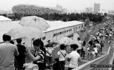 北京奧運會開幕在即,海內(nèi)外游客紛紛來到“鳥巢”附近的觀賞點遠眺拍照。