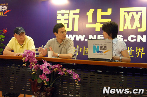 北京奧組委文化活動部景觀處處長曾輝(中)和北京北京奧運會專家委員會委員仲馬(左)13日做客新華網,與網友交流北京奧運景觀形象設計。新華網 李非 攝