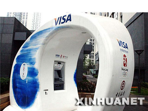 坐落在“綠色家園媒體村”的“青花瓷”ATM自動提款機(7月1日攝)。此款自動提款機以“中國青花藍” 為創意設計,突出北京奧運會“人文奧運”的內涵,在奧運會期間將作為奧運場館內專用ATM自動提款機,為國內外觀眾、奧運會運動員及新聞工作人員等提供取款等各項服務。新華社記者 趙宇思 攝