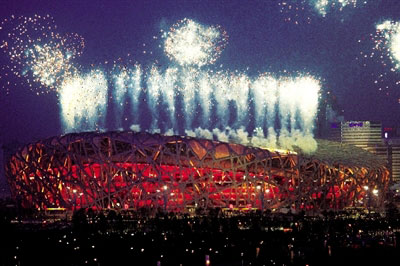 16日晚,北京奧運(yùn)會(huì)開幕式在國家體育場“鳥巢”舉行了帶妝彩排。“鳥巢”夜景照明系統(tǒng)首次全亮燈,并首次在“鳥巢”上空燃放禮花。