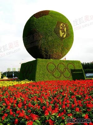 “奧運之星”立體花壇由兩部分組成,由植物組成的足球體直徑為6米,五環(huán)底座高2米。花壇整體造型高大醒目,主題突出,寓意深刻,點明了沈陽在2008北京奧運會中所承辦的足球賽事,同時也象征著沈陽在時代的發(fā)展中滾滾向前。