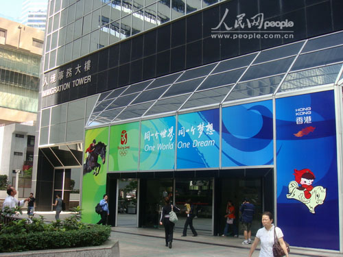香港入境事務(wù)大樓外洋溢著迎接奧運(yùn)的氣氛。