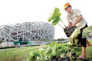 昨天下午,國家體育場“鳥巢”邊的水系開始補種荷花,待8月8日奧運會正式開幕時,這里將會有一片盛開荷花的荷塘。