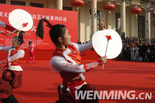 2月9日下午,中國(guó)非物質(zhì)文化遺產(chǎn)傳統(tǒng)技藝大展開幕式在全國(guó)農(nóng)業(yè)展覽館舉行。圖為開幕式上的太平鼓表演。 中國(guó)文明網(wǎng) 王嘯 攝