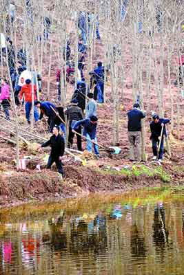 上午10許,植樹現場已一派忙碌,山坡上、公路邊,到處是參加植樹的人,大家挖坑的挖坑,扶苗的扶苗,澆水的澆水,干得熱火朝天。在工作人員的引導下,薄熙來、王鴻舉一到現場,便操起鐵鍬干起來。在植樹的間歇,薄熙來還與身邊同志聊起了森林工程建設的任務。他說,今年“森林重慶”建設要干到570萬畝,任務不輕,要廣泛發動全市人民上山種樹。今天,很多機關干部都來了,機關干部出去種樹,既能綠化山川,也可以感受大自然,有利于健康,一舉兩得!要通過干部種樹,帶動更多的群眾一起參與,共同綠化重慶。