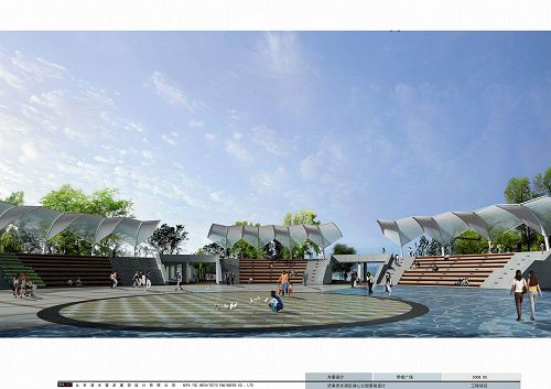 (一)水之門:入口廣場中央設置“水之門”大型半圓水幕構筑物,作為本屆園博會“水=環境”的象征性形象,水幕上方題“第七屆中國(濟南)國際園林花卉博覽會”,水幕顯示“有朋自遠方來不亦樂乎”歡迎字體,構成具有聚集力量的入口廣場。