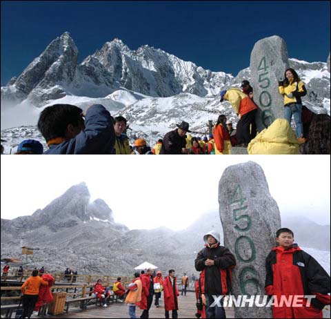 上圖為2004年11月拍攝的游客在海拔4506米留影,下圖是2009年8月22日拍攝的同一地點景色